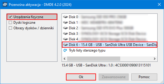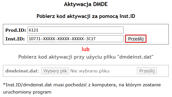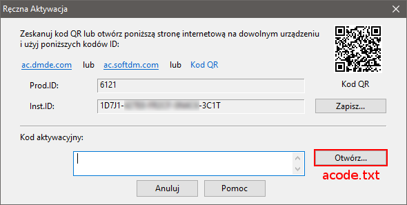 Naciśnij przycisk Aktywacja online. Po pomyślnym połączeniu z serwerem kod aktywacyjny zostanie odebrany automatycznie i zapisany w dmde.ini. Wersja DOS nie obsługuje aktywacji online.